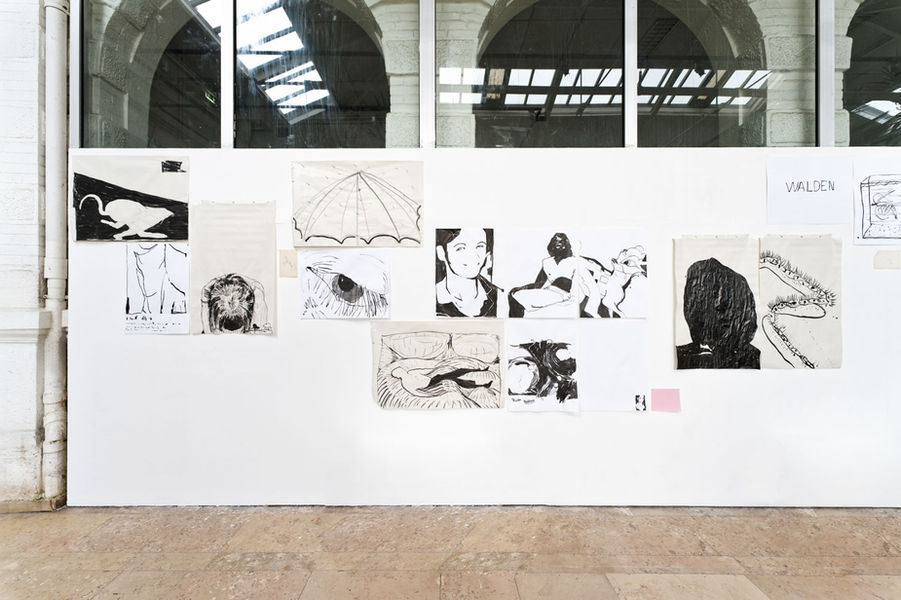 We’ve hung drawings on the walls—on old papers, on large sheets salvaged from children’s workshops, on pearly or pink paper, on very large formats.