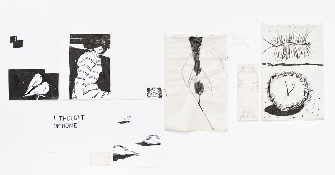 Nos cils se mêlent aux ramures des arbres, aux cils dessinés sur le papier, aux traits jetés d’un geste plus rapide que d’habitude. Quand on se tient au centre de l’espace, on peut voir tous les dessins d’un coup, les attraper entre deux battements de paupières, entre deux palmes courbées.