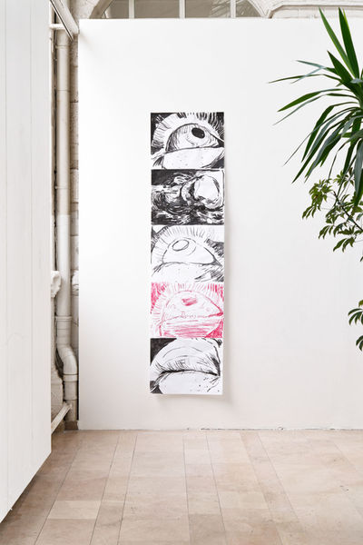 Il y en a certains qui ressemblent à des mouches volantes : un filament mobile qui se glisse dans le champ de vision. Un filet d’encre de chine qui n’occupe qu’une toute petite partie du papier, puis qui vole, qui se glisse sur un autre support, sur un autre format. Les motifs se répètent, se heurtent, se dégagent, s’agrandissent et se télescopent en compositions murales qui multiplient les sensations de déjà-vu et de paréidolie.